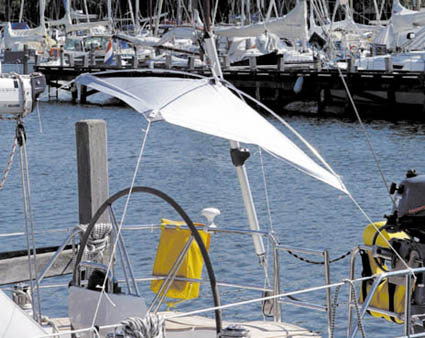 短く折り畳めるカーボンポール、持ち運びに便利な収納袋付き。 セッティングはトッピングリフトをサンシェード中央のグロメットに結び、付属の四隅のロープをパルピットやライフラインに結んでセットします。 サイズ:160cm×160cm●お取り寄せ品になります。1週間以内に入荷できない場合は、改めてご連絡させていただきます。