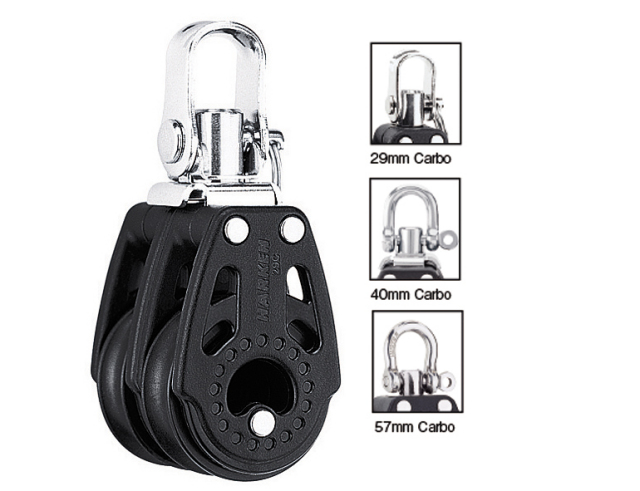 新しいブロックシリーズ 「カーボ・エアブロック」 ハーケン/カーボ・エアブロック ダブル・スイベル ロープ径:~10mm/実用強度:720kg/シーブ径:57mm/全長:121mm/重さ:178g ●お取り寄せ品になります。1週間以内に入荷できない場合は、改めてご連絡させていただきます。