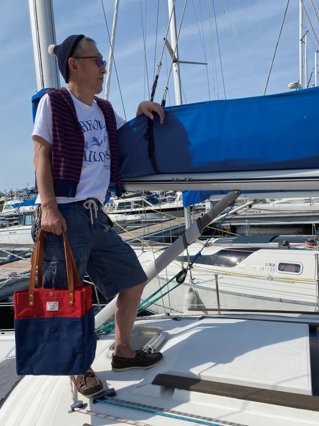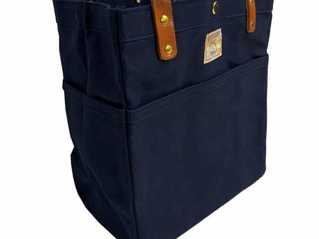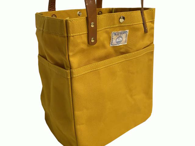 パラフィン(ロウびき)加工した10号帆布で作られたトートバッグ。使うほどに馴染んできます。ショルダー部分は4mm厚のヌメ革を使用しています