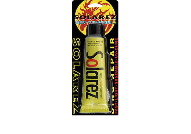 樹脂にはガラス繊維が混ざって比較的粘度が高く、日のあたらない場所で補修部分に塗り、直射日光に当てればたちまち硬化。